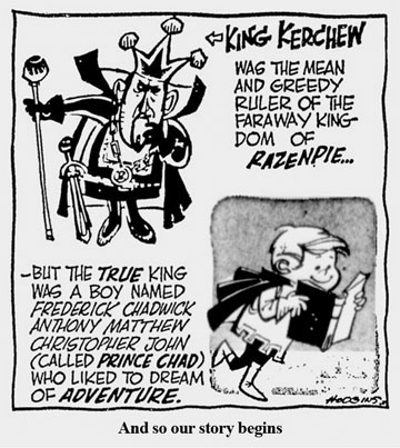To make matters worse, he wasn’t even a real king. The true king was a little boy named Frederick Chadwick Anthony Matthew Christopher John, called Prince Chad, for short. Kerchew was Chad’s uncle and was merely acting king until the boy was old enough to rule.