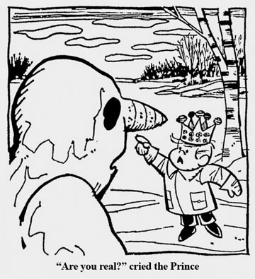 The Prince ran up to the Snowman. He looked behind it and on top of it and all around it, but he could not find anybody. Just then the groan came again and he saw it was the Snowman that was groaning!